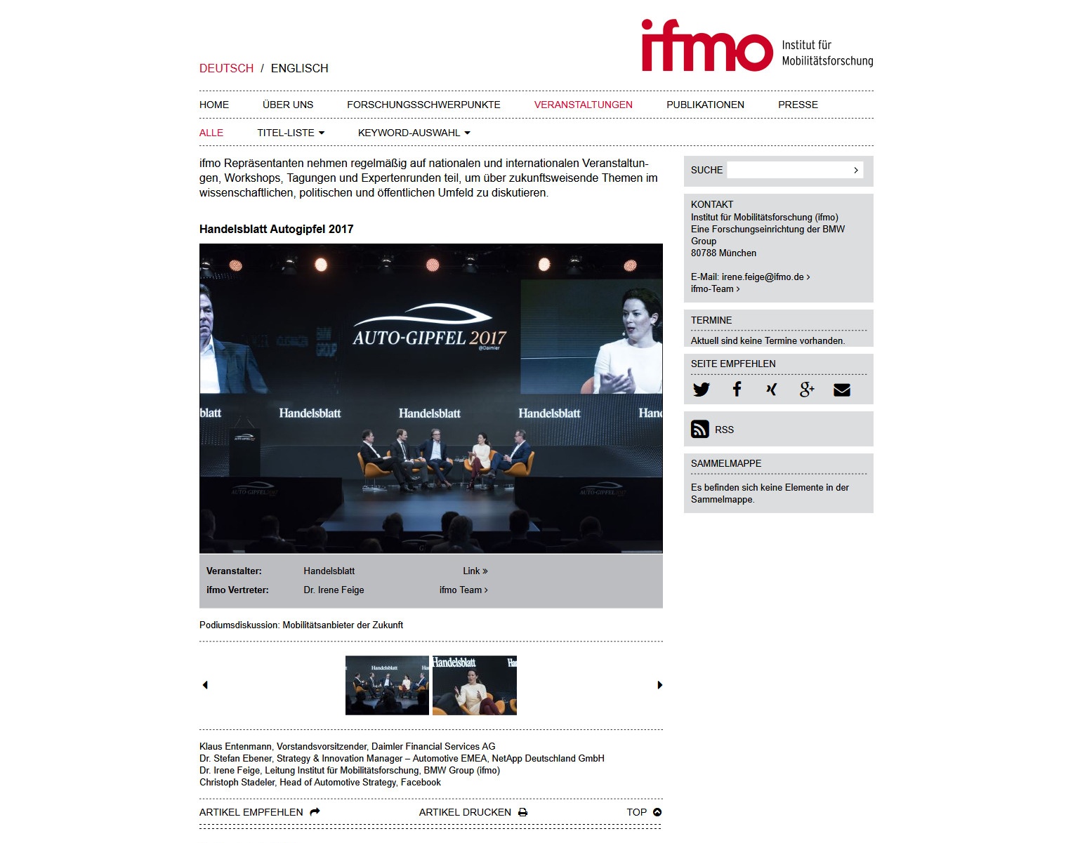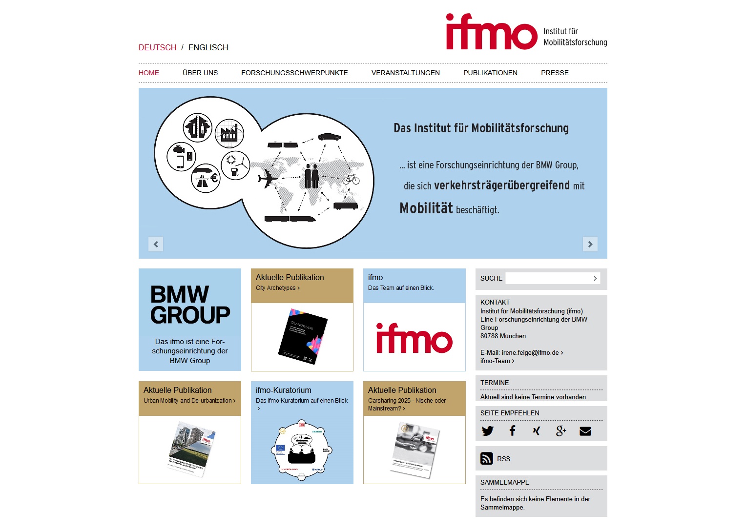 Das Institut für Mobilitätsforschung ist eine Forschungseinrichtung der BMW Group, die sich verkehrsträgerübergreifend, interdisziplinär und mit internationaler Perspektive mit Mobilität im weitesten Sinne befasst. Die zweisprachige Website des Instituts dient der Publikation von Forschngsergebnissen sowie der Vor- und Nachbereitung von Veranstaltungen.