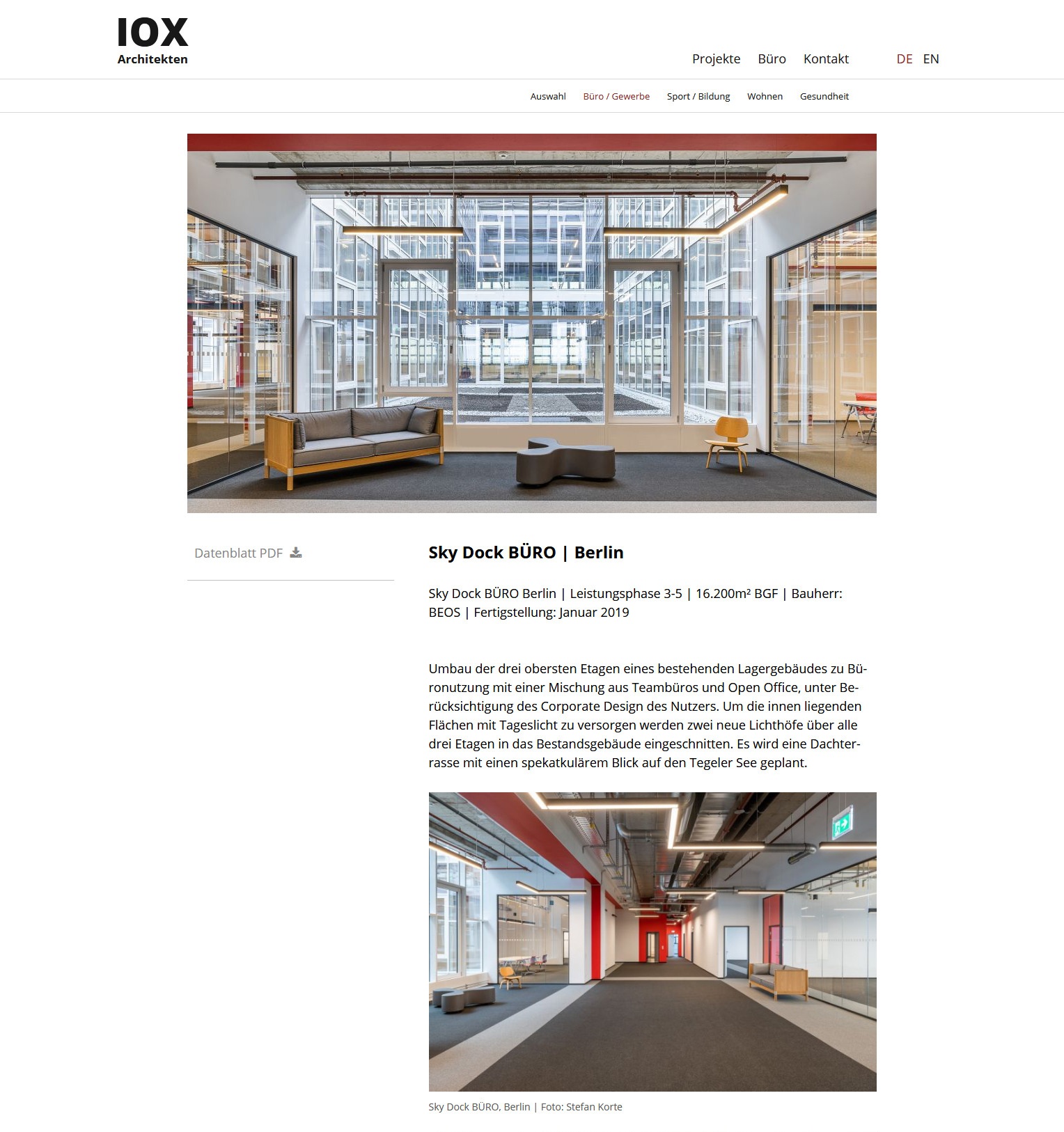 IOX Architekten sind ein Berliner Architekturbüro, dass Räume zum Wohnen und Arbeiten in den Bereichen Büro, Gesundheit und Sport erschafft. Die Formen I und O und X stehen für Klarheit, Sensibilität und die Fähigkeit, Ideen und Wissen zu etwas Neuem zu verbinden. Das Layout der Website folgt daher einer klaren Formensprache, die die Projekte des Büros in den Vordergrund stellt.
