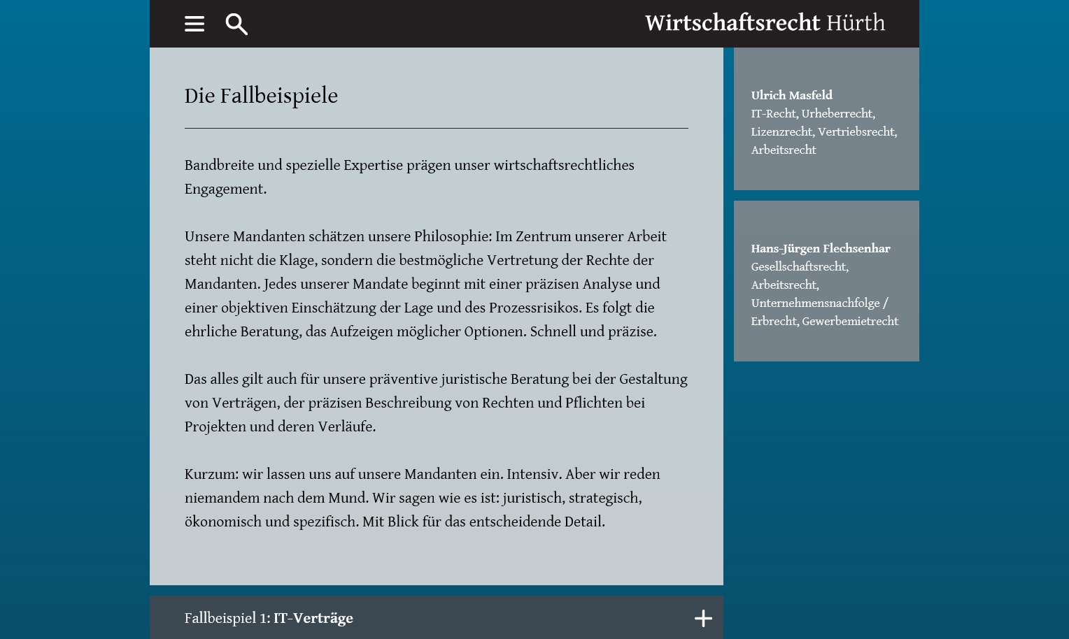Um potentiellen Mandanten das Arbeitsfeld näher zu bringen, werden auf der Website Fallbeispiele aus unterschiedlichen Bereichen des Wirtschaftsrechts vorgestellt.