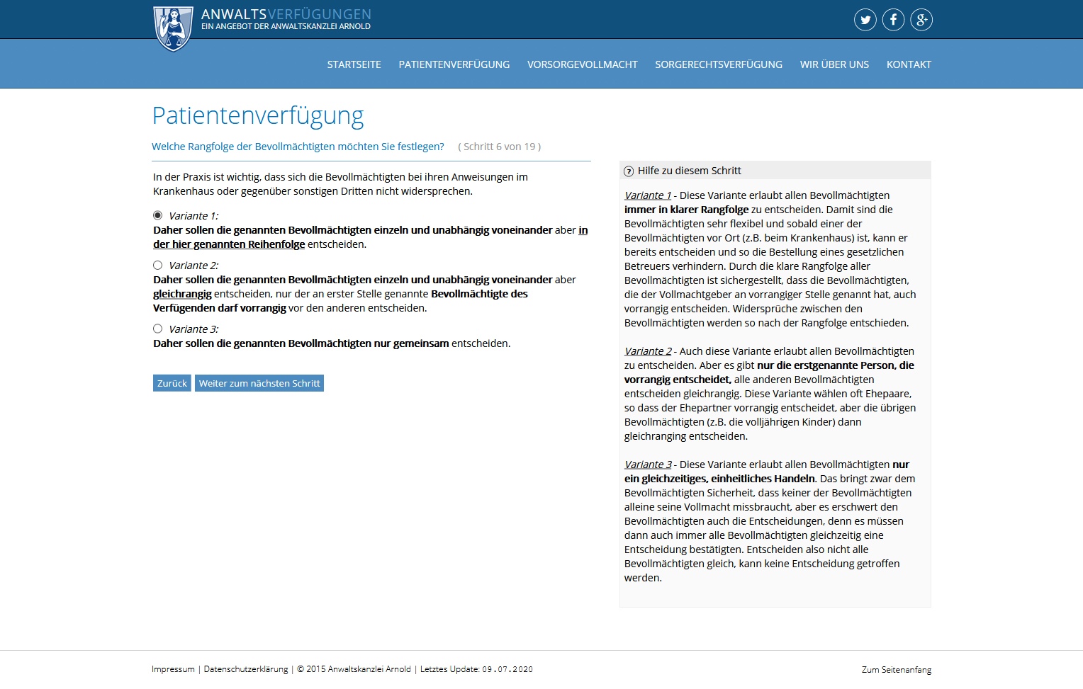 anwaltsverfuegungen.de ist ein Angebot der Kanzlei Arnold. Auf der Website ist es möglich, individualisierte Vorsorgedokumente wie Patientenverfügungen oder Sorgevollmachten mit Hilfe eines interaktiven Dialogsystems zu erstellen.