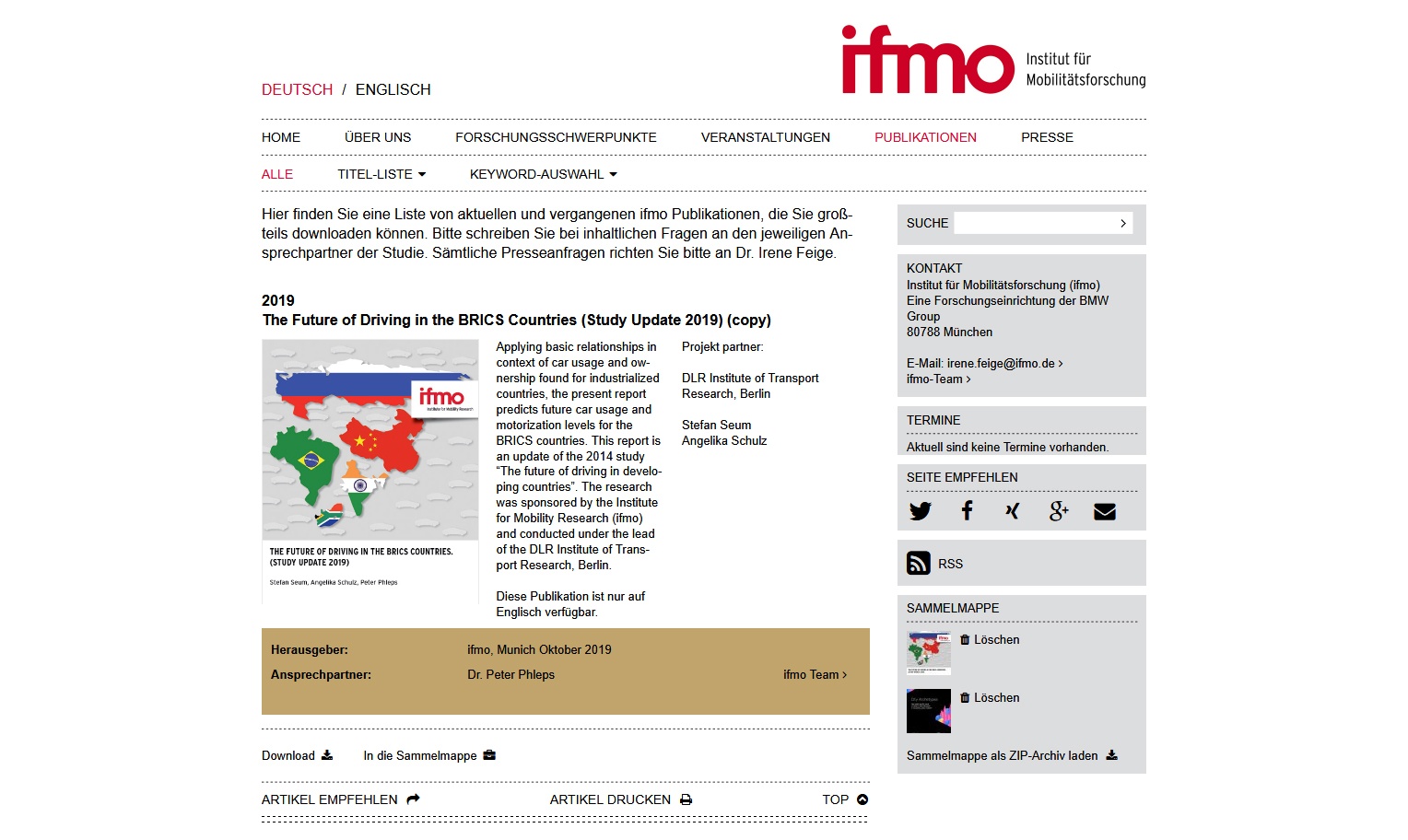 Das Institut für Mobilitätsforschung ist eine Forschungseinrichtung der BMW Group, die sich verkehrsträgerübergreifend, interdisziplinär und mit internationaler Perspektive mit Mobilität im weitesten Sinne befasst. Die zweisprachige Website des Instituts dient der Publikation von Forschngsergebnissen sowie der Vor- und Nachbereitung von Veranstaltungen.