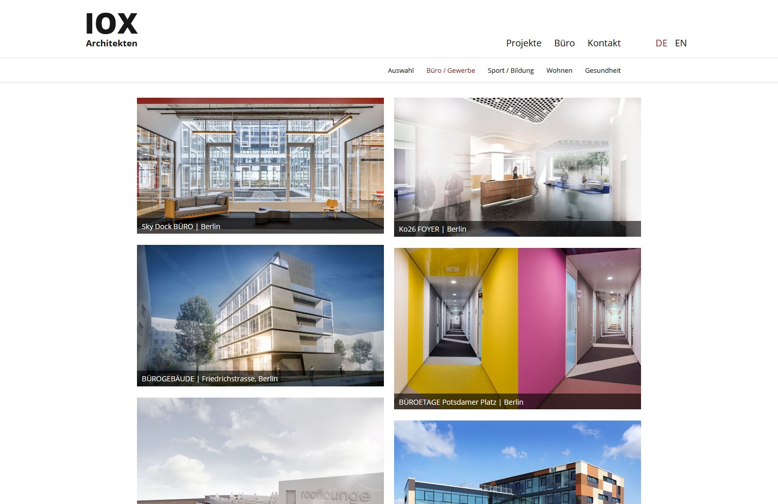 IOX Architekten sind ein Berliner Architekturbüro, dass Räume zum Wohnen und Arbeiten in den Bereichen Büro, Gesundheit und Sport erschafft. Die Formen I und O und X stehen für Klarheit, Sensibilität und die Fähigkeit, Ideen und Wissen zu etwas Neuem zu verbinden. Das Layout der Website folgt daher einer klaren Formensprache, die die Projekte des Büros in den Vordergrund stellt.