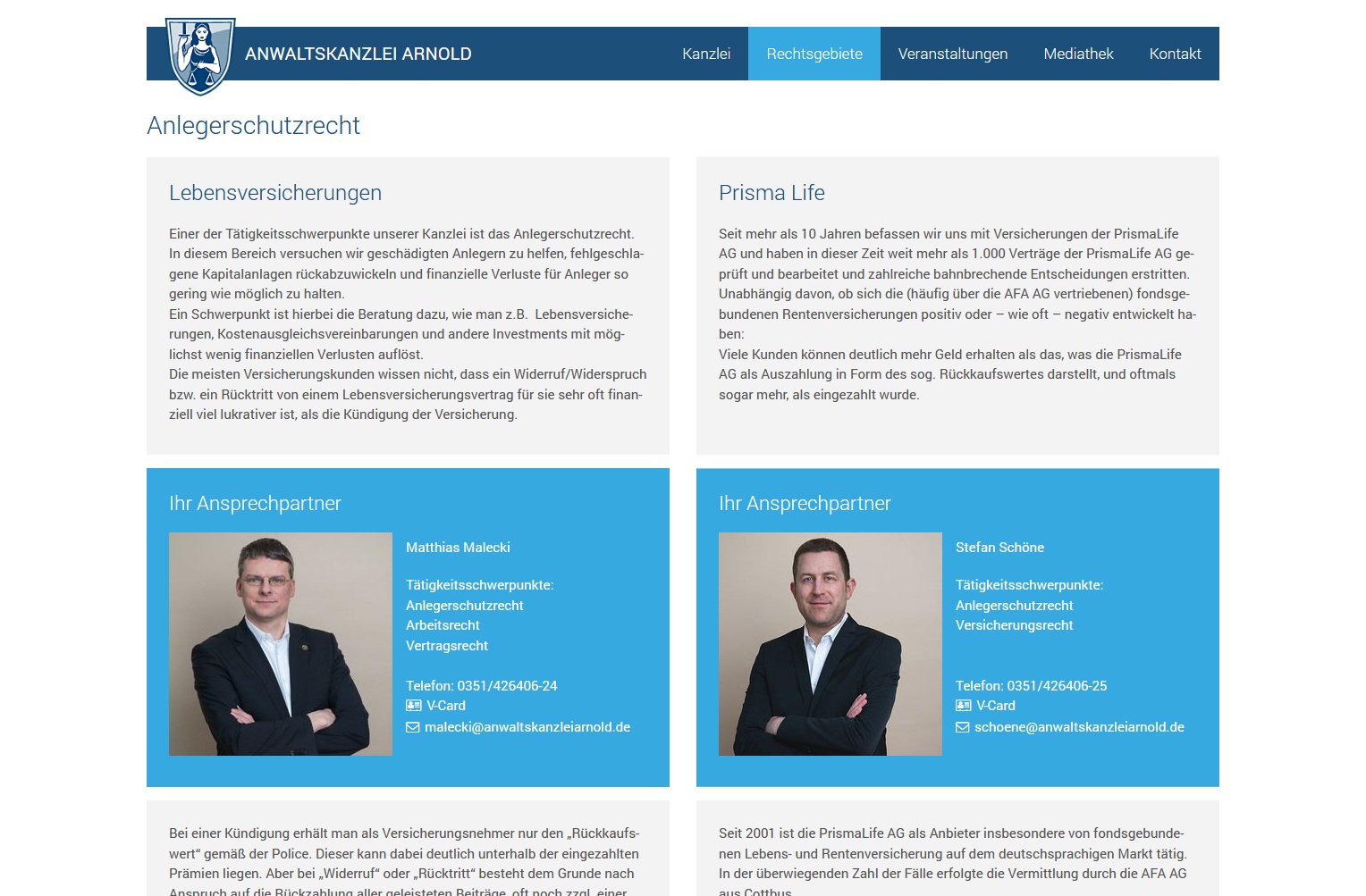 Die Anwaltskanzlei Arnold mit Sitz in Berlin und Dresden ist auf Anleger- und Vermittlerrecht sowie auf rechtliche Fragen rund um Vorsorgeverfügungen spezialisiert. Im letztgenannten Bereich bietet die Kanzlei deutschlandweit regelmäßige Informationsveranstaltungen an.