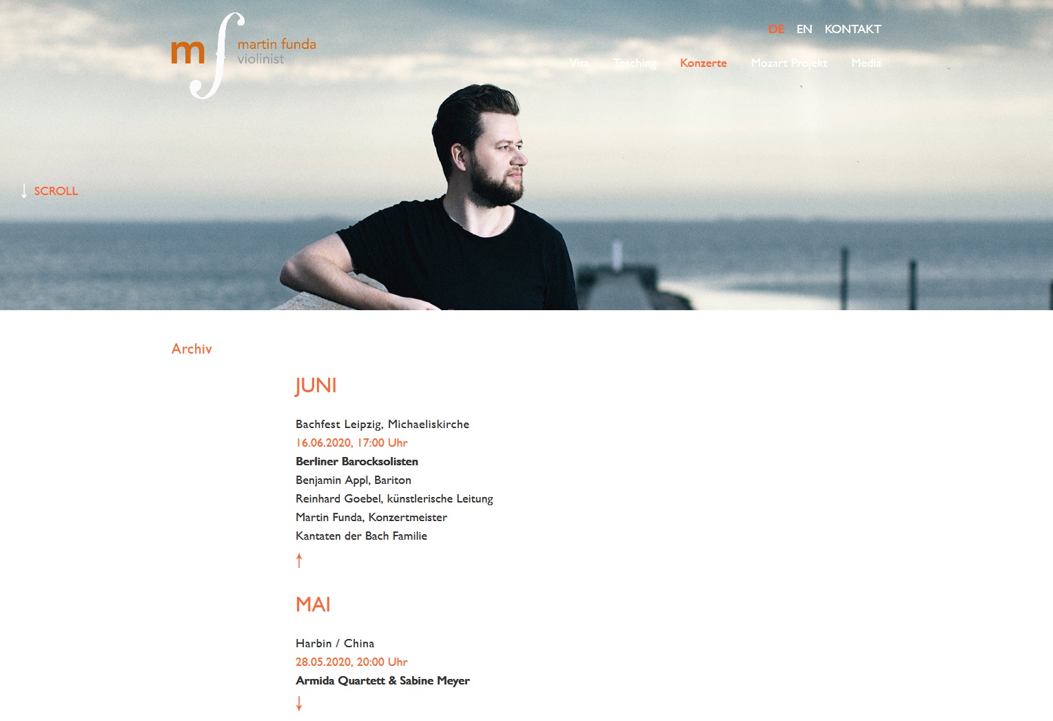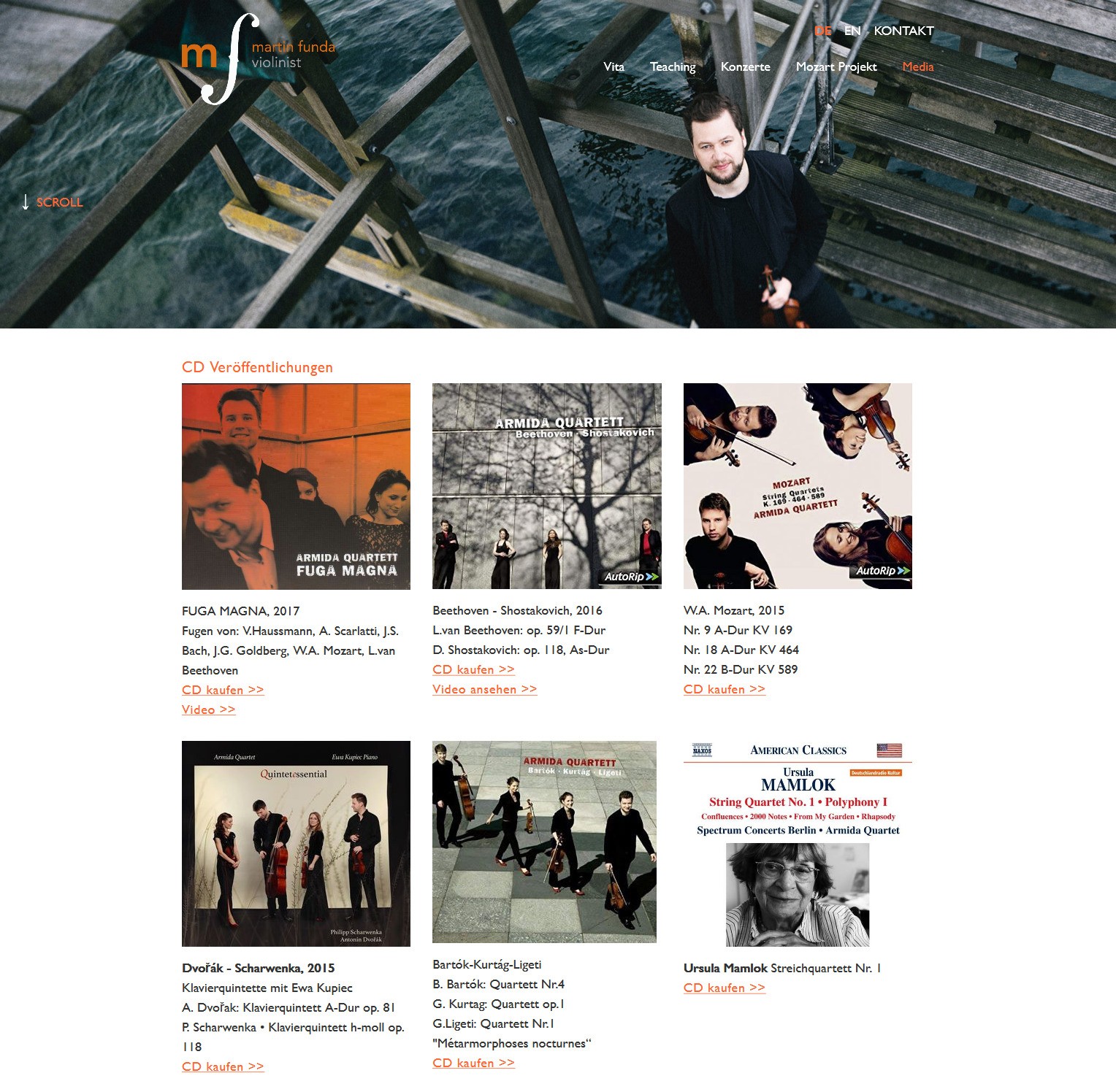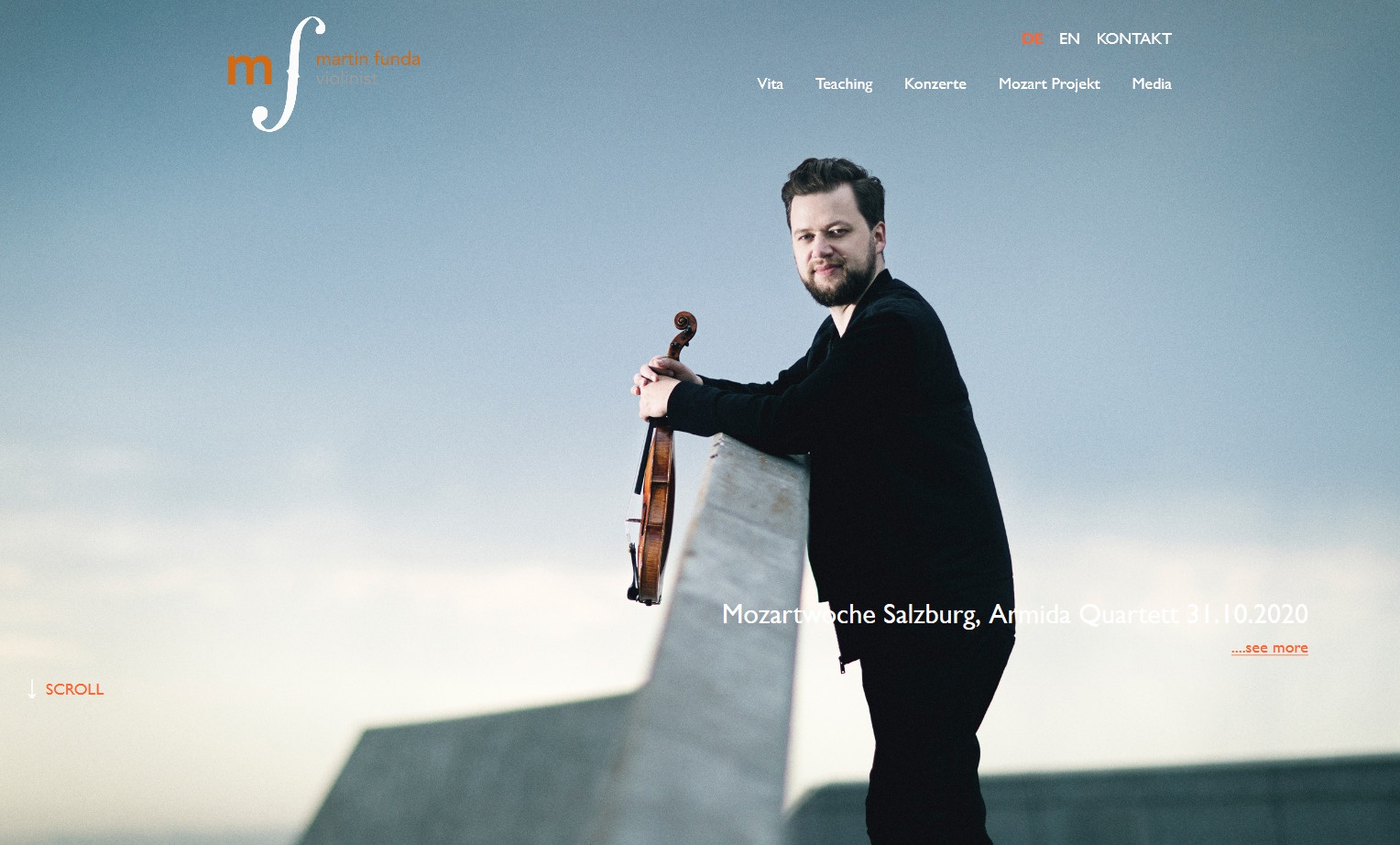 Die Website stellt Martin Funda als Violinist und Pädagoge vor. Besucher können sich hier über seine Lehrtätigkeit, vor allem aber über sein künstlerisches Schaffen informieren. Ein Konzerkalender bietet Informationen zu künfitgen und bereits stattgefundenen Konzerten.