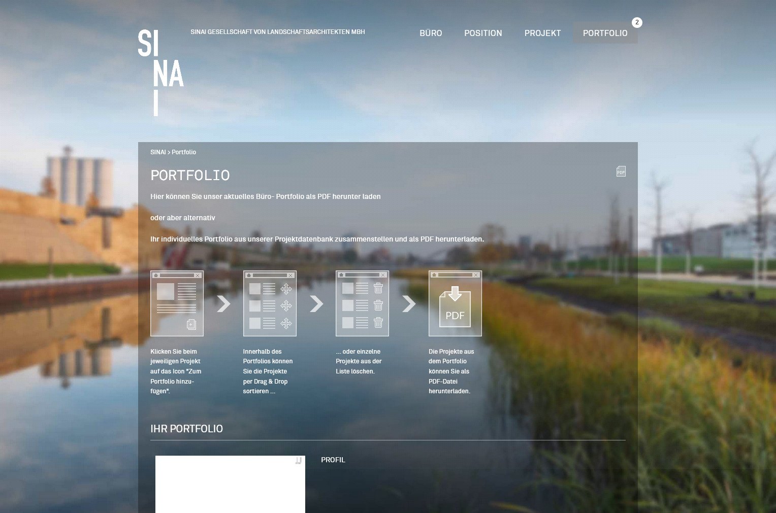 Einzelne Projekte können von Besuchern der Website zu einem individuellen Portfolio zusammengestellt werden. Innerhalb dieses Portfolios ist es möglich, Projekte zu sortieren oder zu löschen. Das so erstellte Portfolio kann abschließend als PDF heruntergeladen werden.