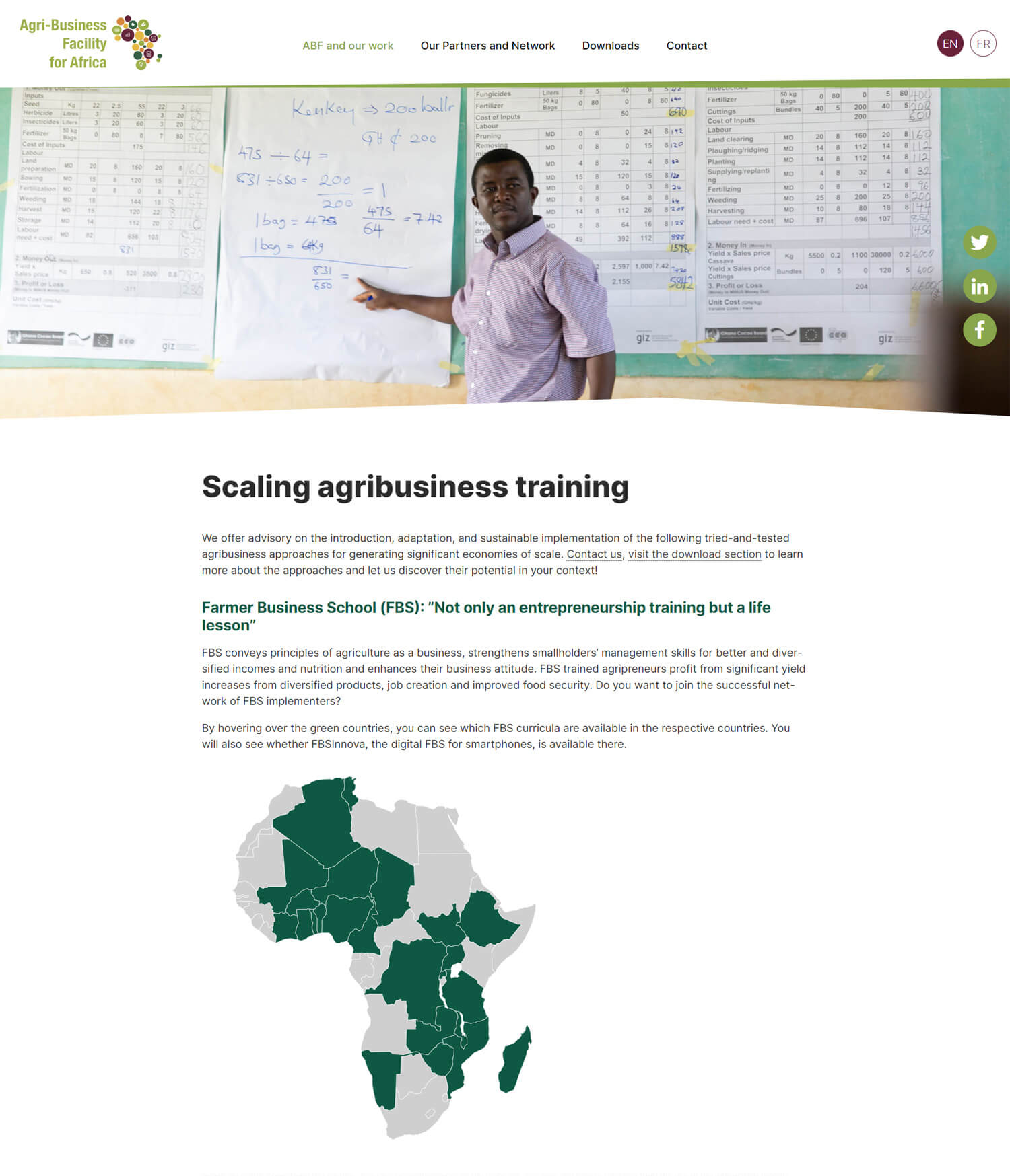 Die Agri-Business Facility (ABF) berät Organisationen, Entwicklungsprogramme und Netzwerke dabei, Agribusiness-Trainings in Afrika anzupassen und breitenwirksam durchzuführen. Dazu gehören die FBS, die Cooperative Business School (CBS) und die Processor Business School (PBS). Das Programm unterstützt ausgewählte Landwirtschaftsschulen und Ausbildungszentren dabei, Studierende und junge Fachleute zu Multiplikator*innen für diese und andere Ansätze zu qualifizieren. Schwerpunkte sind dabei auch Geschäftsmodelle für die Selbstfinanzierung von Trainings.