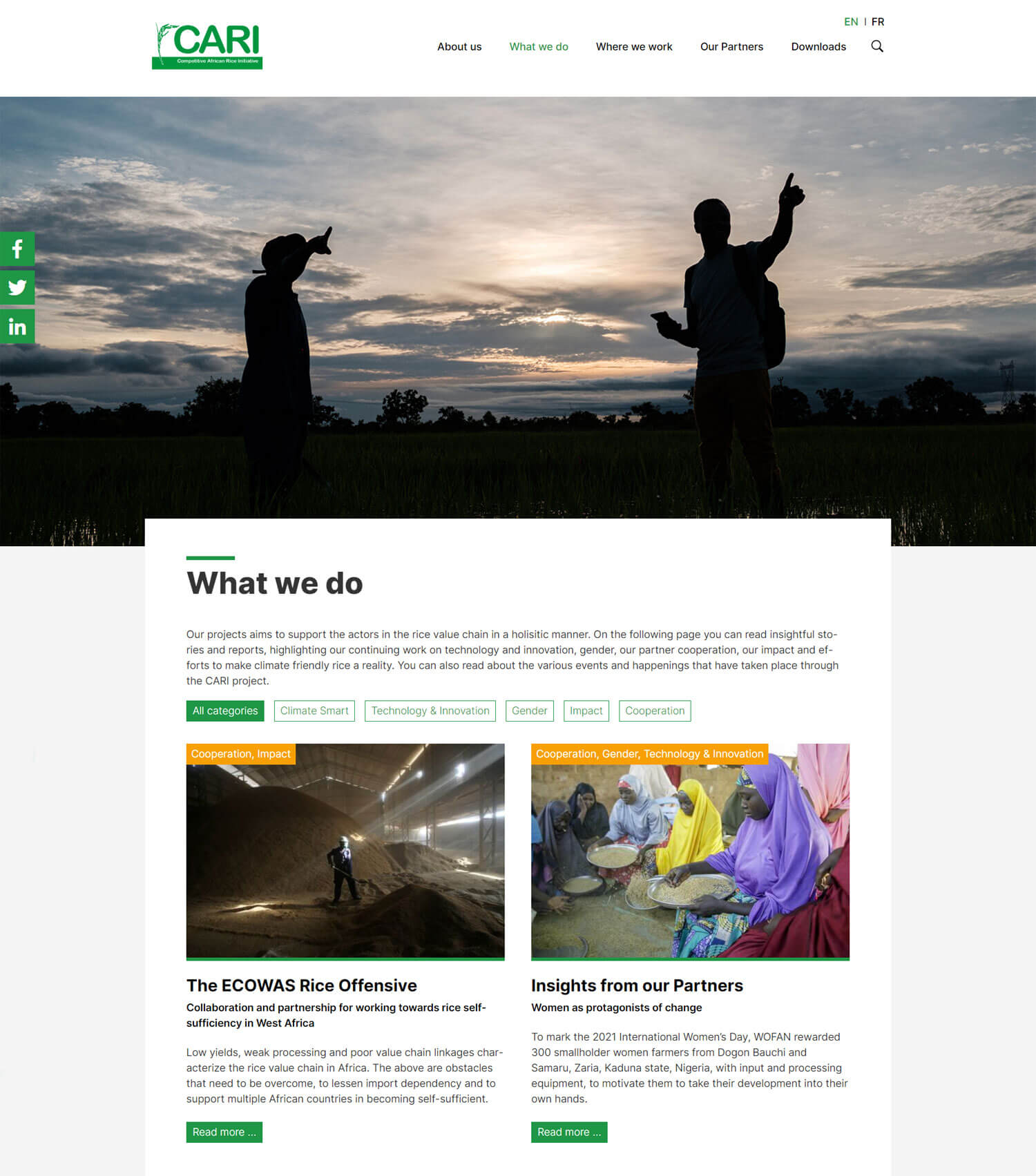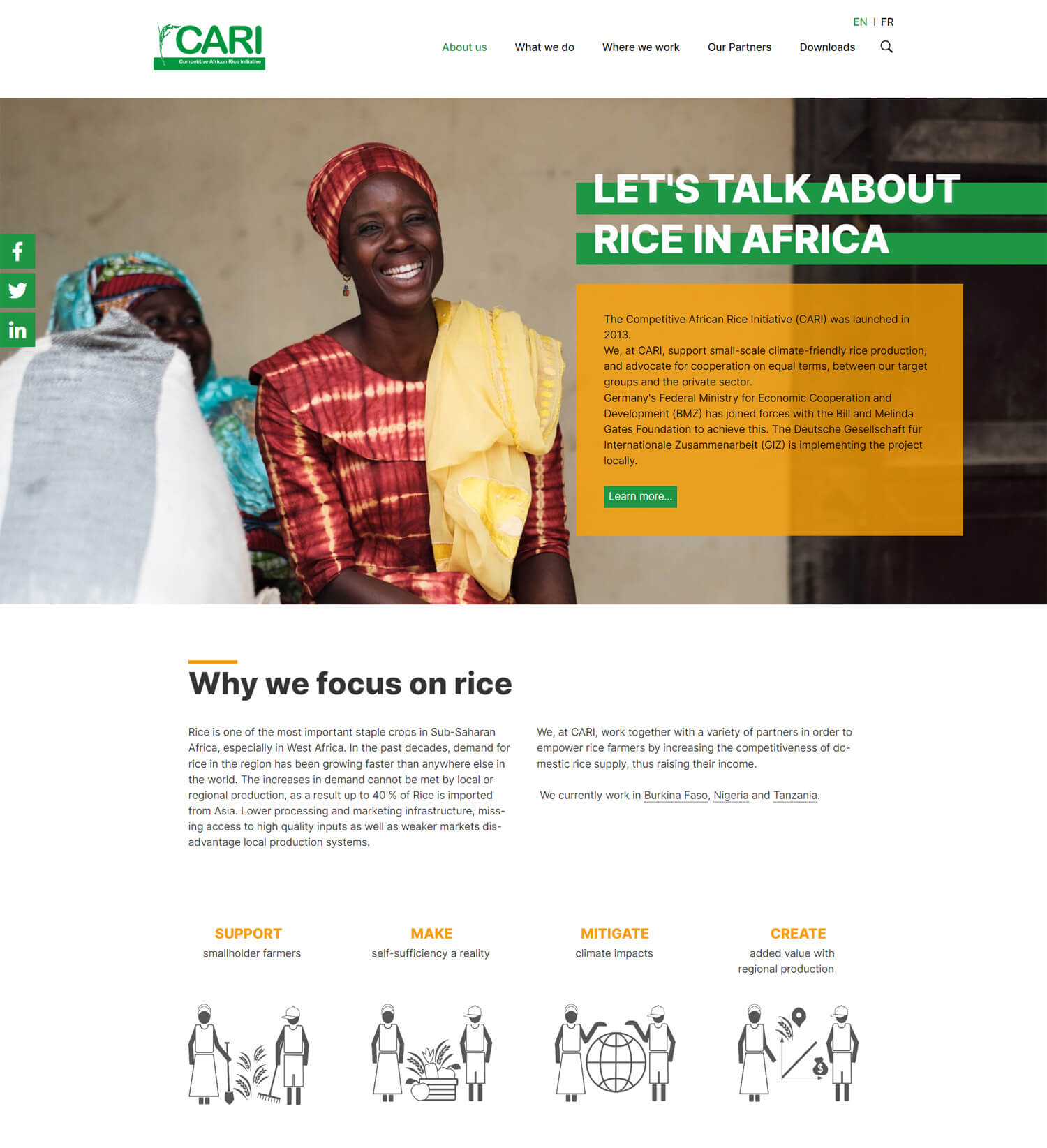 CARI - die Competitive African Rice Initiative - unterstützt den klimafreundlichen Reisanbau in kleinem Maßstab und setzt sich für eine gleichberechtigte Zusammenarbeit zwischen seinen Zielgruppen und dem Privatsektor ein. Das Bundesministerium für wirtschaftliche Zusammenarbeit und Entwicklung (BMZ) hat sich dazu mit der Bill and Melinda Gates Foundation zusammengetan. Die Deutsche Gesellschaft für Internationale Zusammenarbeit (GIZ) führt das Projekt vor Ort durch.